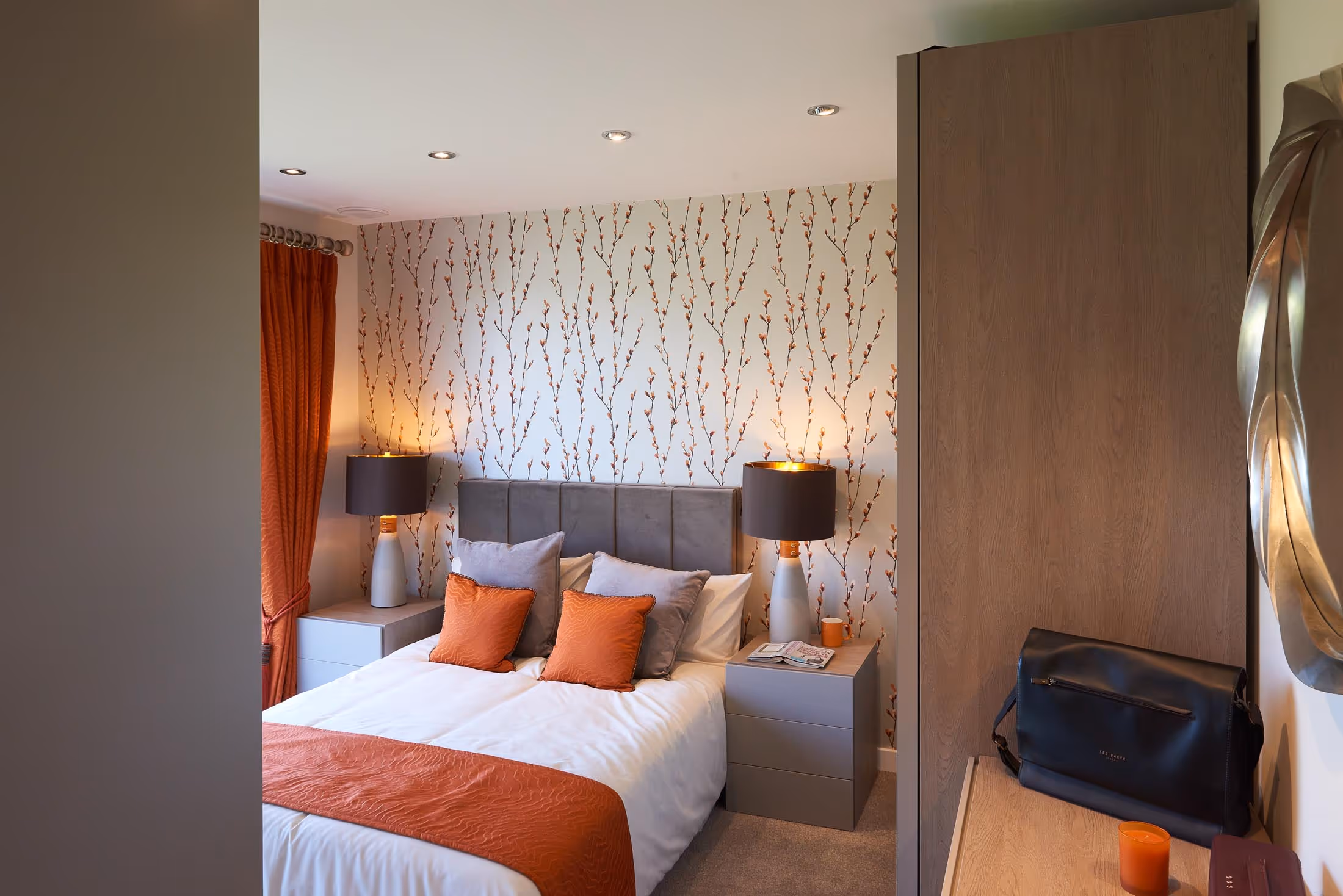 Another bedroom and wardrobe setting using the lovely Novamobili. The three-drawer freestanding bedside unit perfectly matches the sliding wardrobe and TV unit. The large wardrobe with a cleaver swivel TV unit reveals hidden shelves. The small but essential details like interior lights, soft close drawers, and doors create a luxury feel.