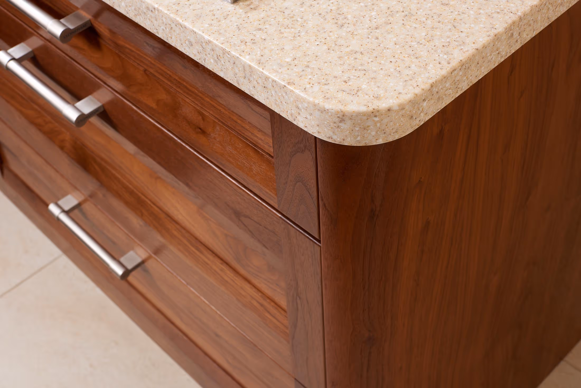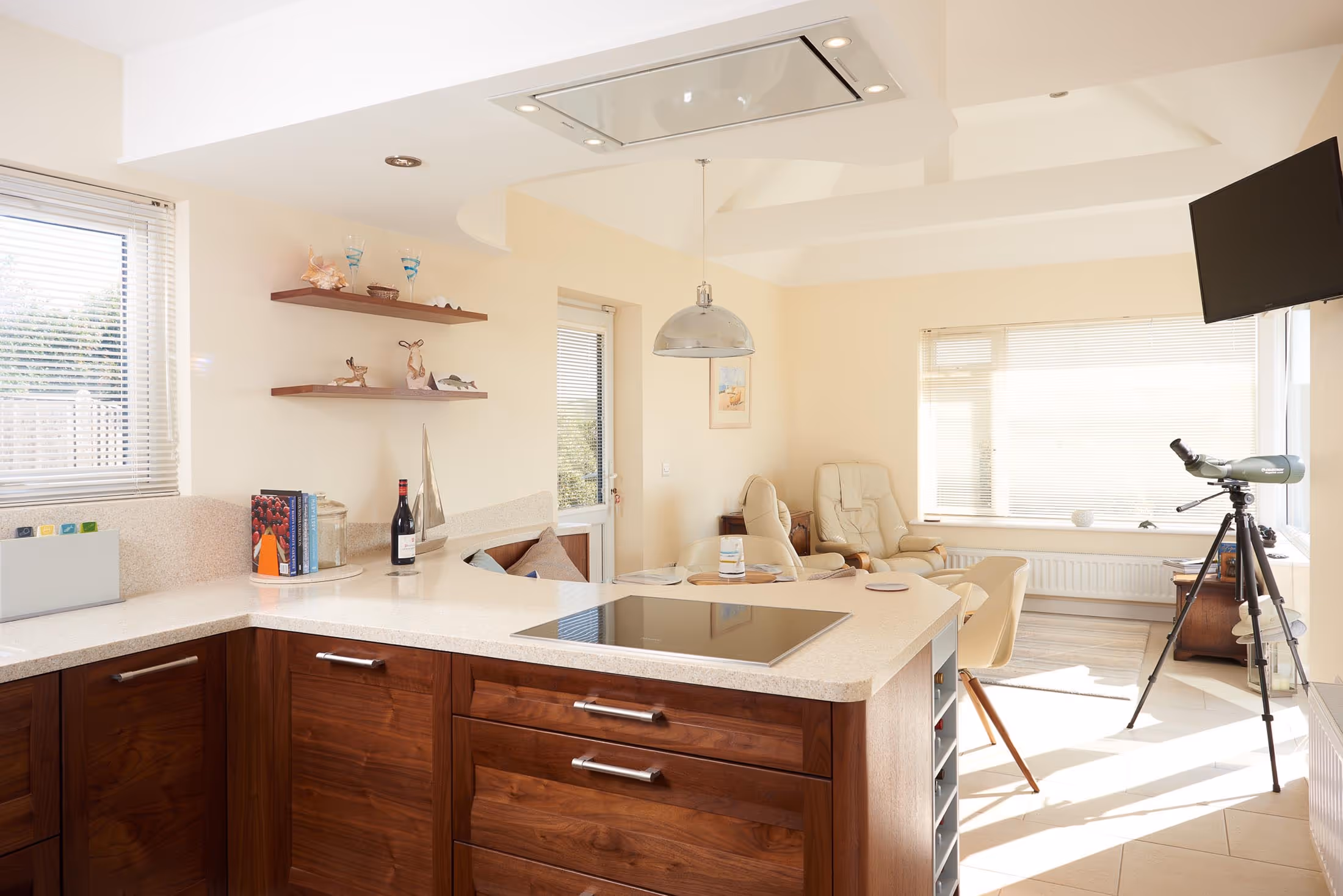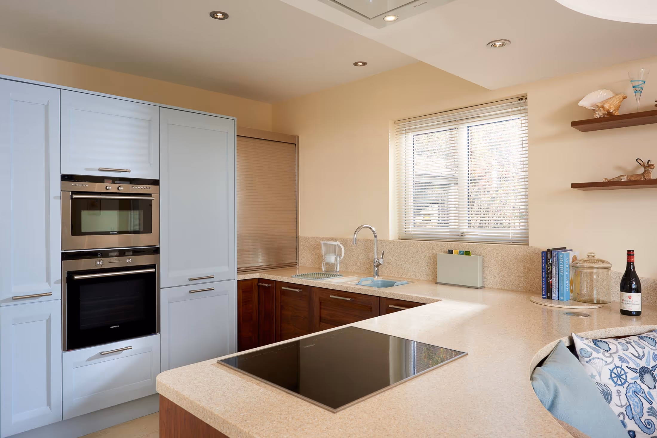The Stoneham units combine their exclusive bevelled shaker style door in Strata Blue Ashes, which links with the beautiful sea views and the complementary American Walnut bringing a natural warmth, including a seamless worktop and curves which softens lines.