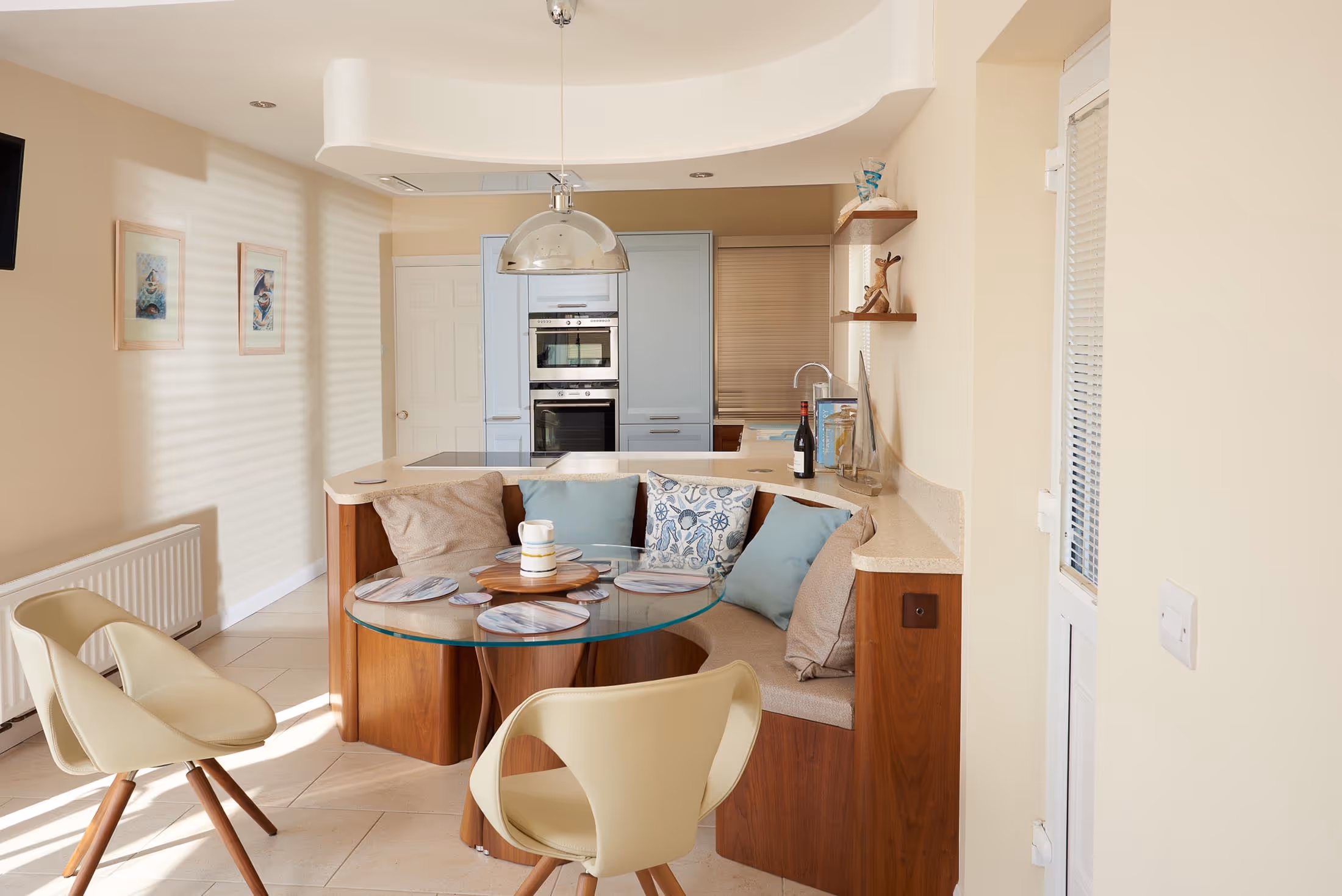 The most fantastic view can be admired while relaxing in the bespoke curved seating area, which was achieved by incorporating the curved seating booth with a work area peninsular.
